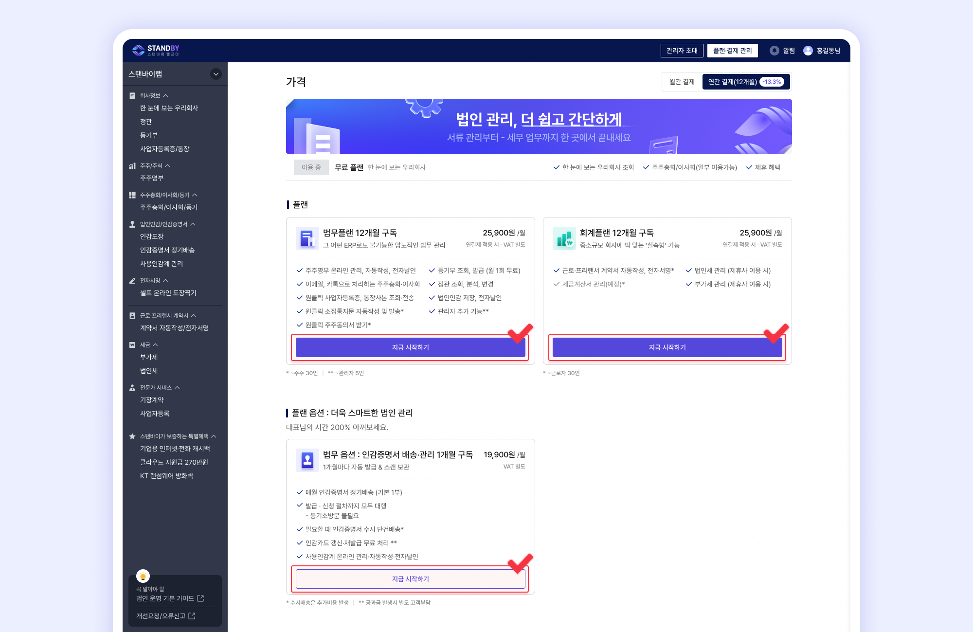 우측 상단 [플랜/결제 관리]에서 플랜을 확인하고 시작할 수 있어요.