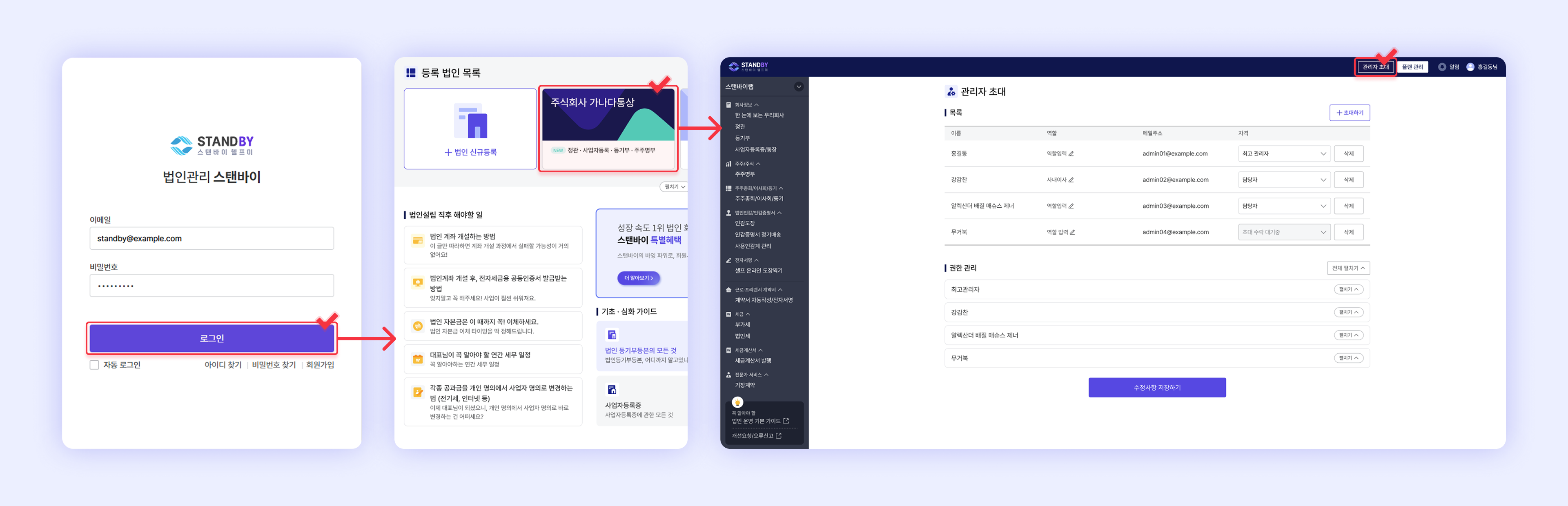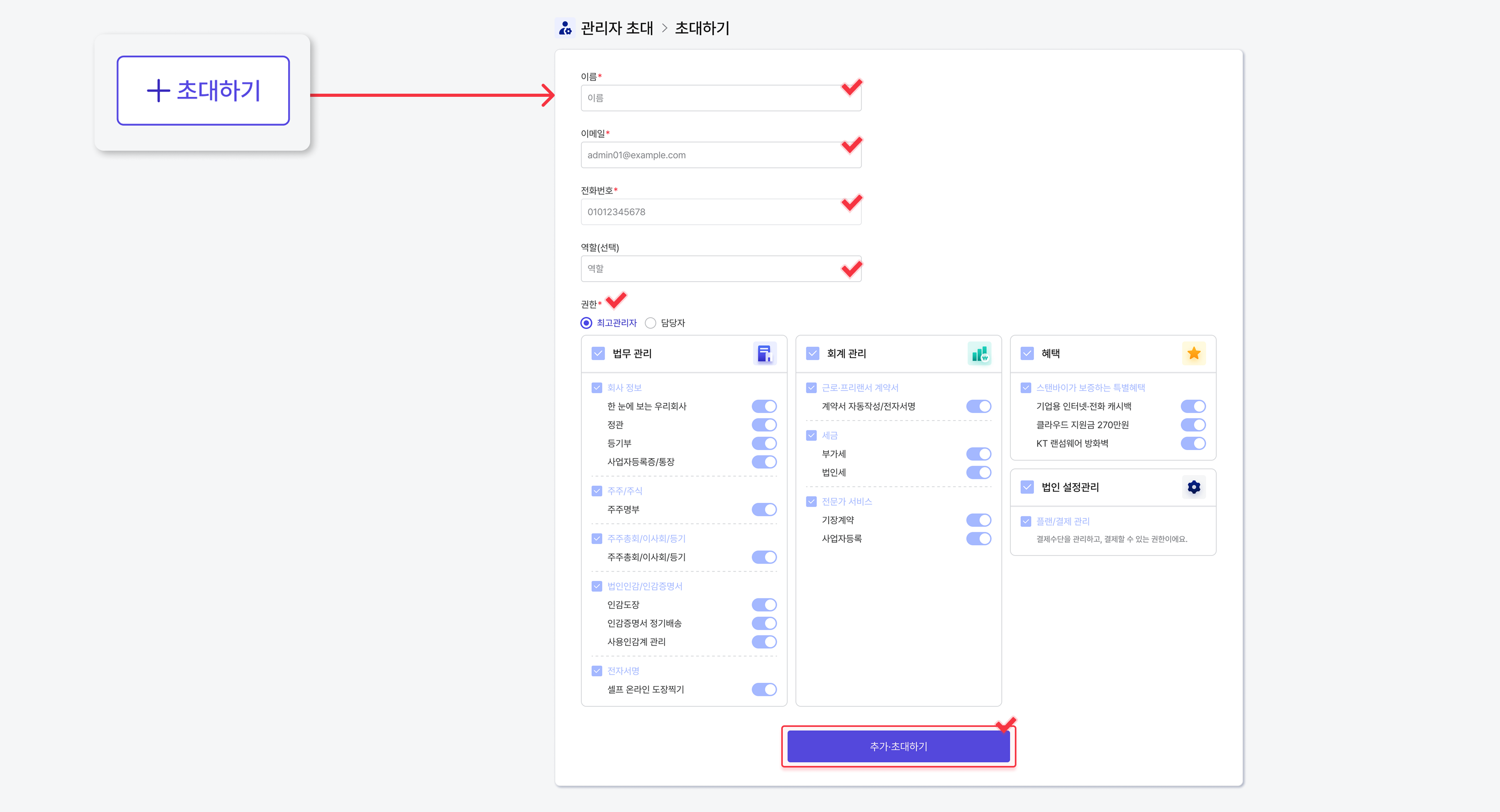 등록하신 법인의 [관리자 초대]에서 관리자를 초대하고 관리할 수 있어요.