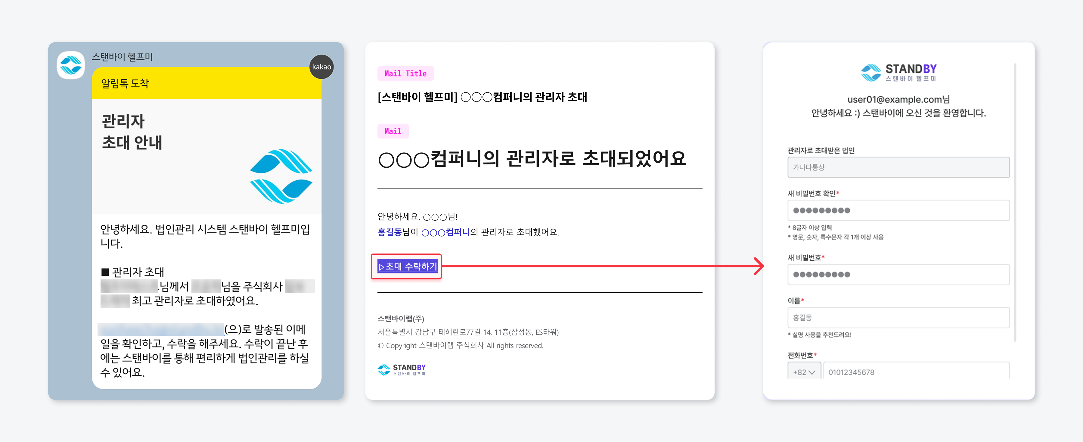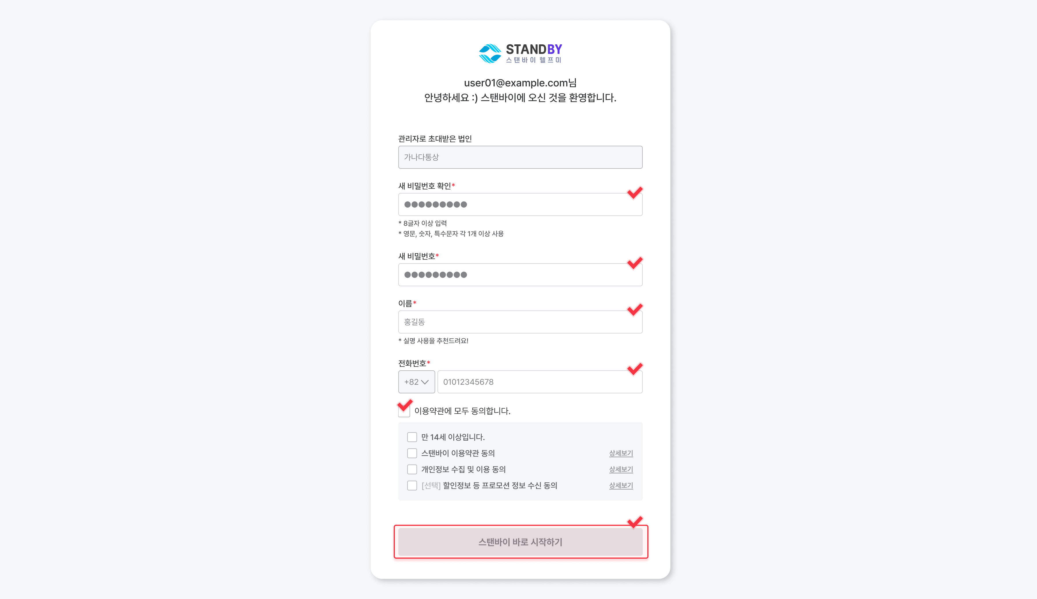 필수 정보를 입력하면 법인의 관리자로 스탠바이를 이용할 수 있어요.