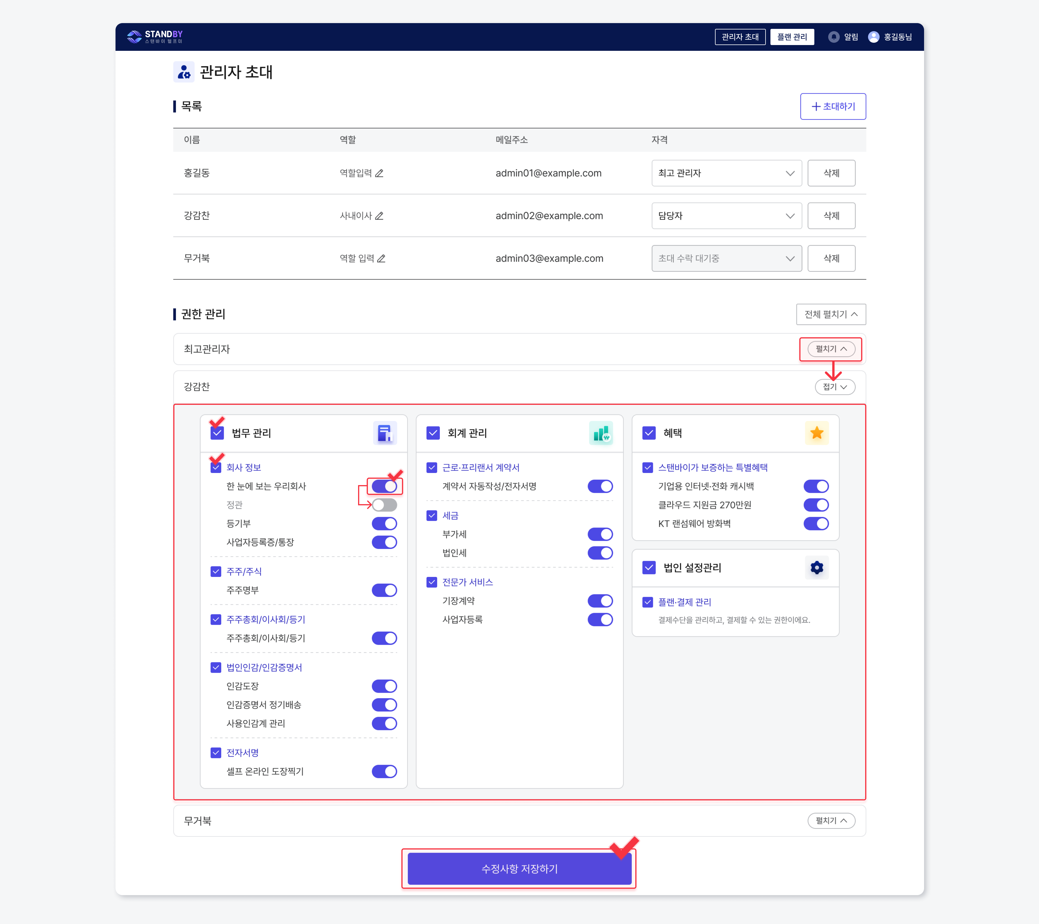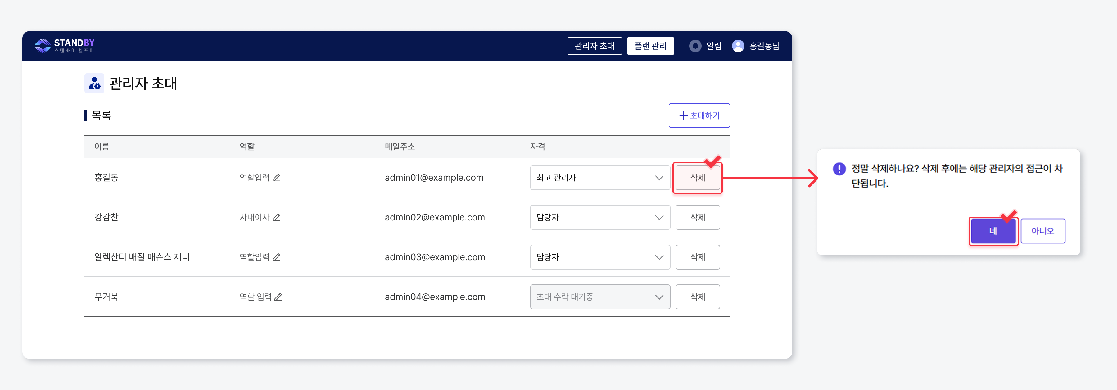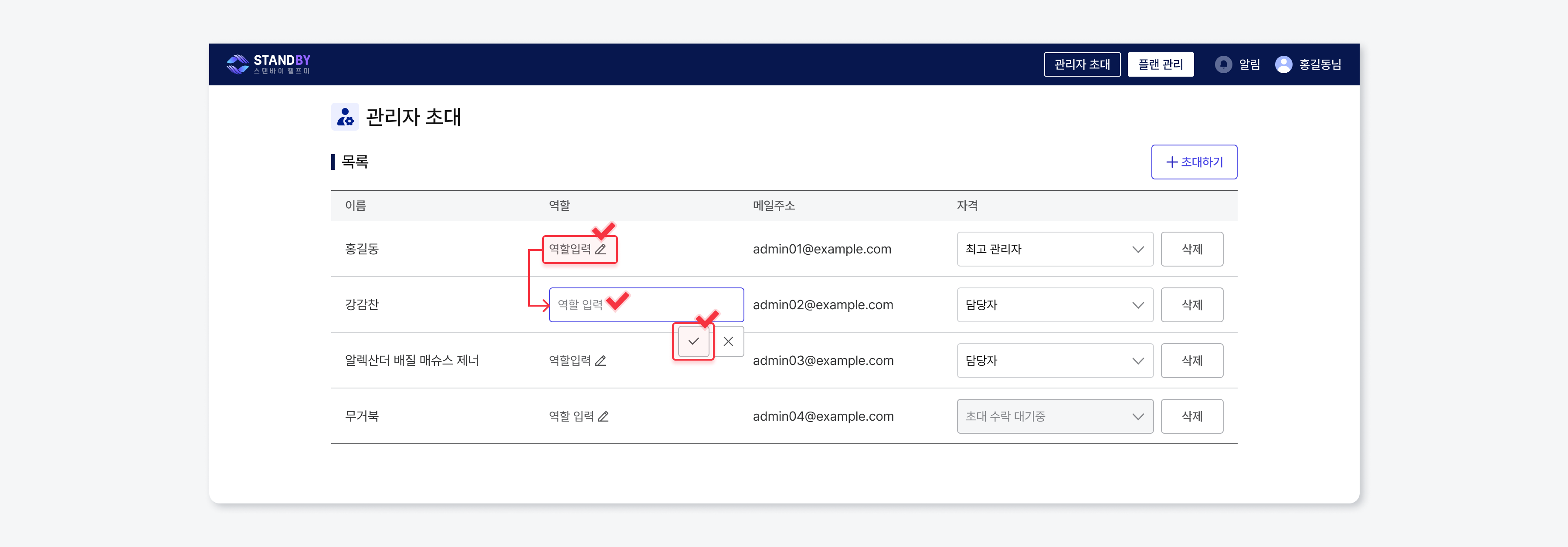 초대가 완료된 관리자의 역할을 권한을 수정하고, 삭제할 수 있어요.